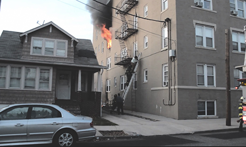 Above: A woman awaits rescue on a fire escape at a Beech St. fire Sunday afternoon in Kearny. She was ultimately brought to safety without incident. (Photo courtesy of Andrew Taylor via Youtube).